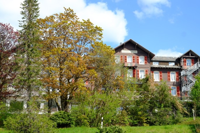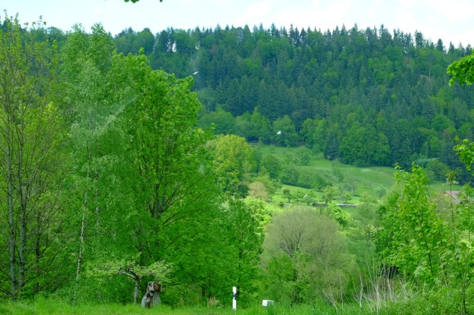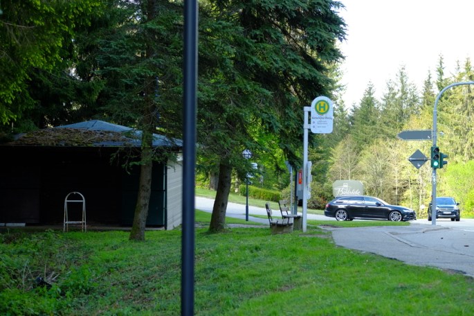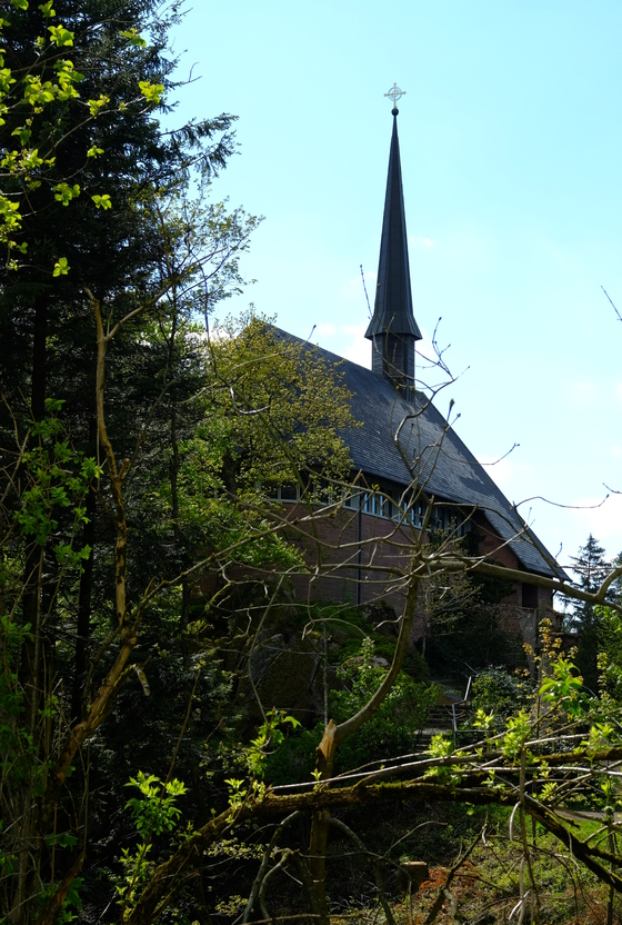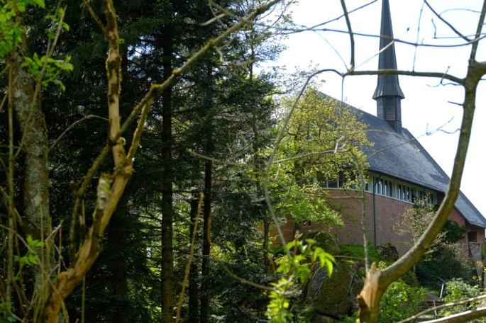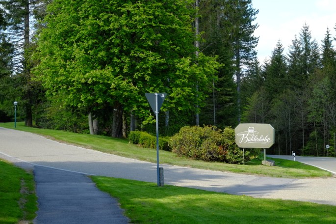 Gut gestärkt konnte es nun über die Schwarzwaldhochstraße gehen. Die Auffahrt und Ausblicke fanden wir jetzt nicht so spannend. Teilweise hatten wir von fantastischen Ausblicken gehört und gelesen, diese waren aber auf dem ersten Stück bis zur Bühler Höhe sehr spärlich und ans Anhalten war schon gar nicht zu denken. So fuhren wir hinter dem Hotel Bühler Höhe auf einen Wanderparkplatz. Von hier war mitten im Wald die Marienkirche zu sehen. Auf der anderen Seite der Bundesstraße gehen Wege ab, die zum Luchspfad und zum Wildnispfad führen. Da wir aber schon recht spät dran waren und es hier oben auch ziemlich kalt und windig war, haben wir unsere Fahrt fortgesetzt.